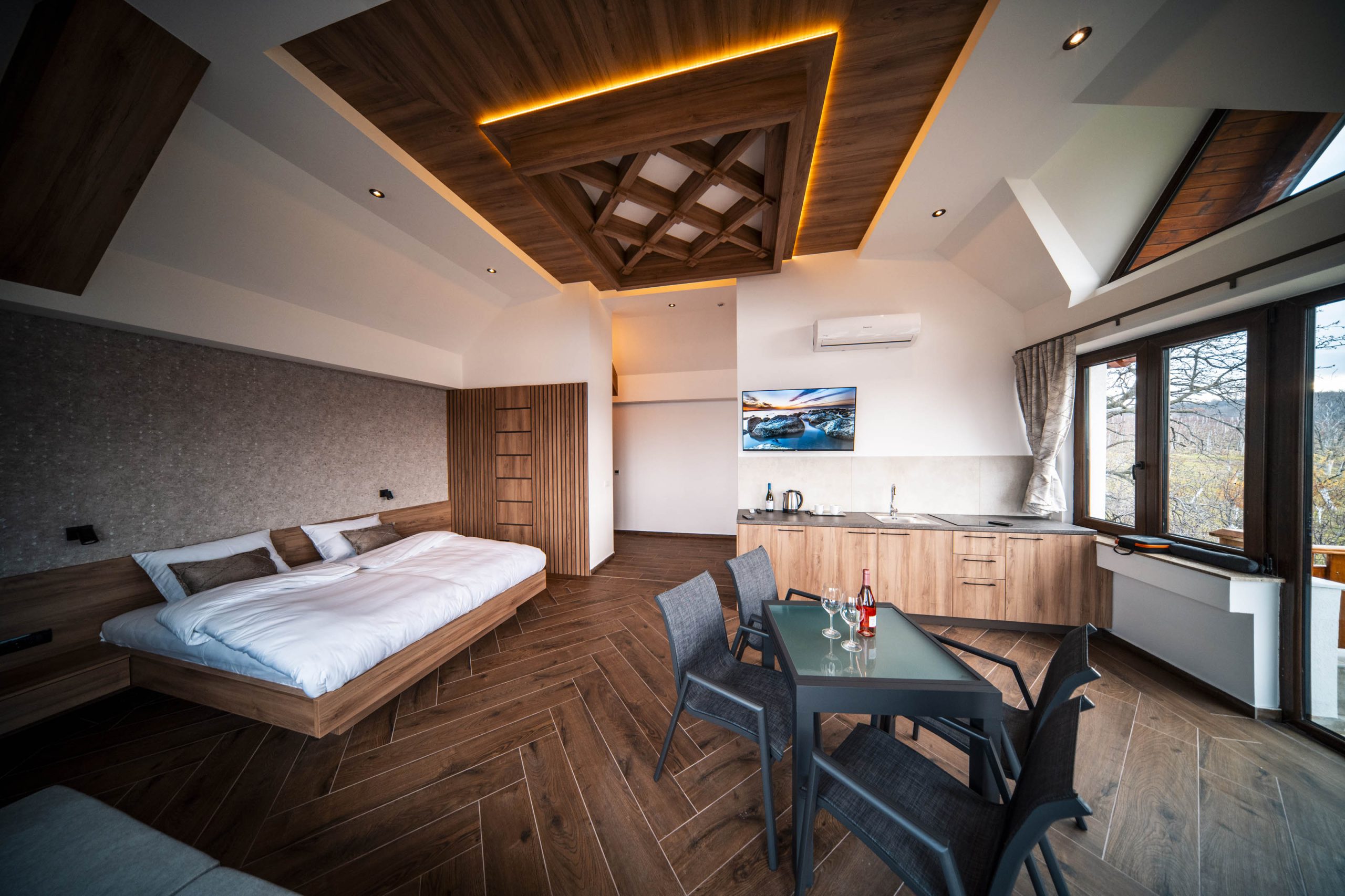 Svaki apartman opremljen je komfornim krevetima, čajnom kuhinjom i terasom sa pogledom na vinograde i okolne predele.